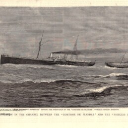 a) Five Minutes after the Collision – The Boats of the ‚Princesse Henriette‘ picking up survivors from the ‚Comtesse de Flandre‘ / b) The ‚Princesse Henriette‘ towing the Stern-Half of the ‚Comtesse de Flandre‘ towards Ostend Harbour