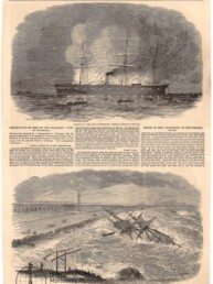 Flottenmanöver vor dem Kaiser von Österreich in Pola, Originalzeichnung von F. Schlegel; links oben: Der Kaiser in der Batterie des ‚Tegetthoff‘; rechts oben: Der Kaiser fährt zu den Panzerdrehtürmen