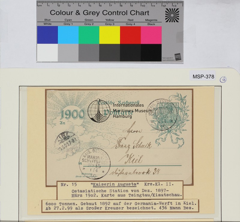Ganzsache aus Tsingtau, Schiffsname/Landeinheit: Kaiserin Augusta; Frankatur, Mi.-Nr.: 5 Pfg, Mi.-Nr. P43 Aae; Poststempel: KDMSP Nr. 15 1 4 00, Kiel 19.5.00 7-8; Nebenstempel: [Keine]